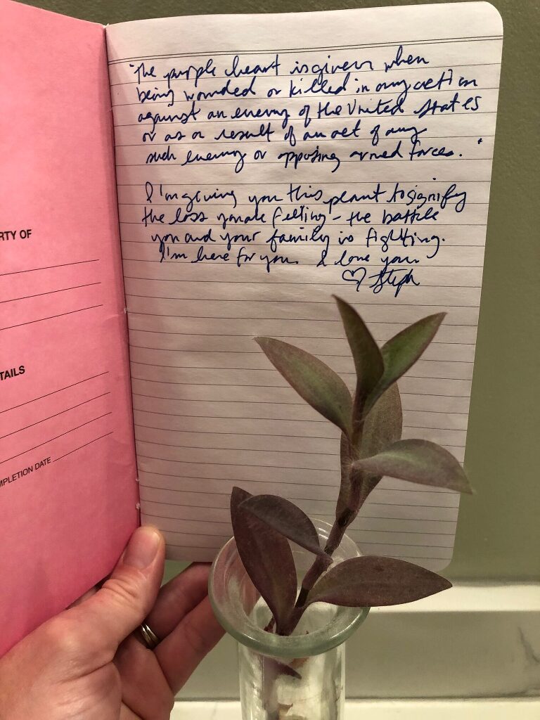 “The purple heart is given when being wounded or killed in any action against an enemy of the United States or as a result of an act of any such enemy or opposing armed force.” I’m giving you this plant to signify the loss you are feeling- the battle you and your family is fighting. I’m here for you. I love you. Love, Steph