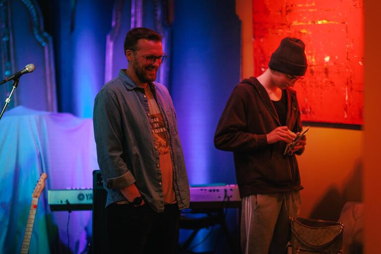 Old and new friends, sitting close, listening with smiles, nodding their heads to the music.